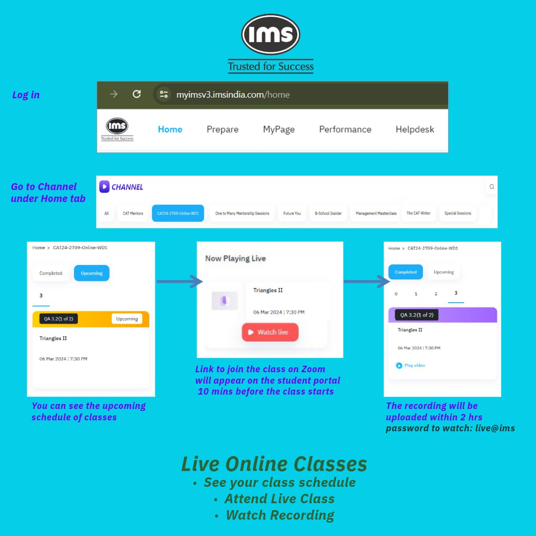 Follow the below steps to find your online class schedule, attend live classes and watch class recordings effortlessly. Below are the steps to access from your Desktop/PC. You can also do the same from your myIMS3.0 App.