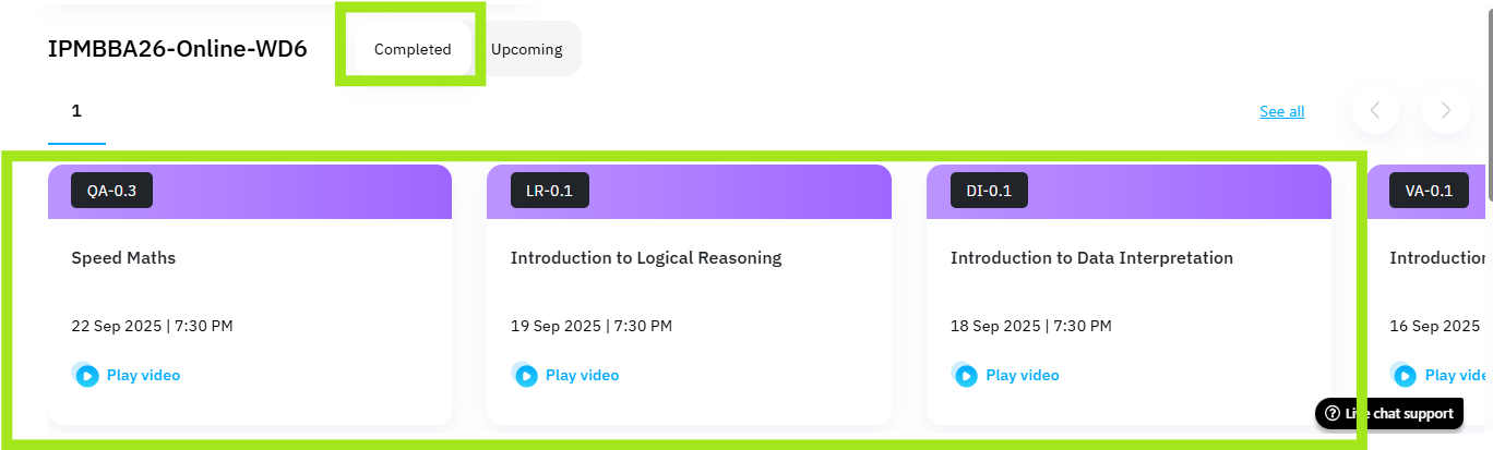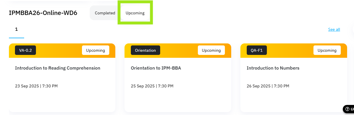 Click on the tab with your batch name in channel to find two tabs "Completed" and "Upcoming". Click on "Upcoming" to view the next week's upcoming online session schedule. Online class schedules for each month will be uploaded a few days before the beginning of a month.