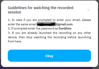 Click Play Video: Select the class recording you want to watch and click on Play Video. This will open up a pop-up window as shown below. You can click on the "Okay" button.