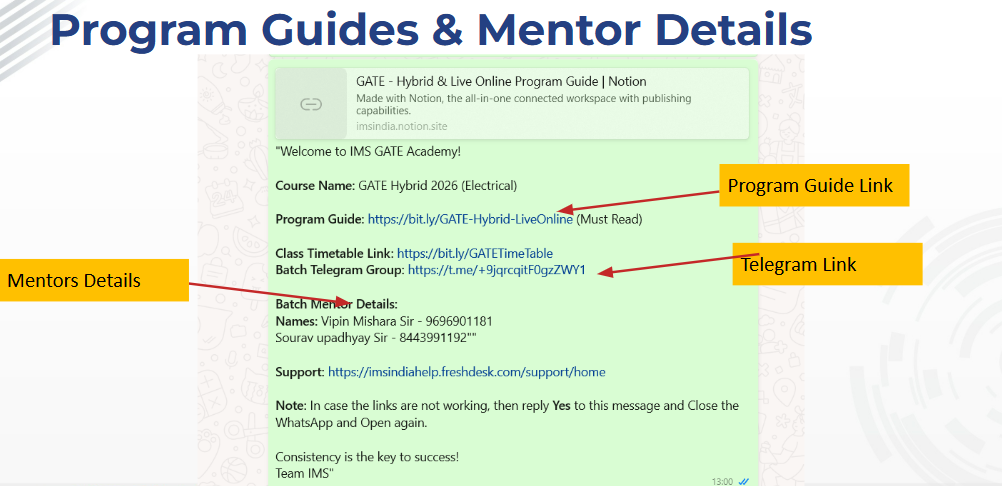 After enrollment, you will receive a Welcome Message on WhatsApp or email, including links to the program guide, mentor contact details, and your batch's Telegram group.